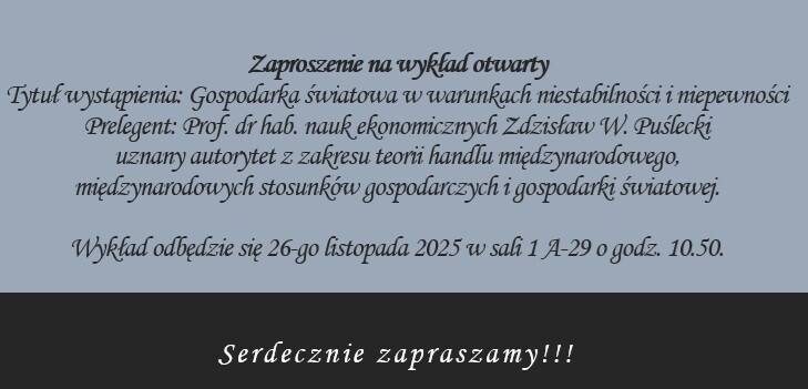Instytut Ekonomii i Finansów serdecznie zaprasza na wykład otwraty pt. „Gospodarka światowa w warunkach niestabilności i niepewności”, który wygłosi Prof. dr hab. nauk ekonomicznych Zdzisław W. Puślecki uznany autorytet z zakresu teorii handlu międzynarodowego, międzynarodowych stosunków gospodarczych i gospodarki światowej.